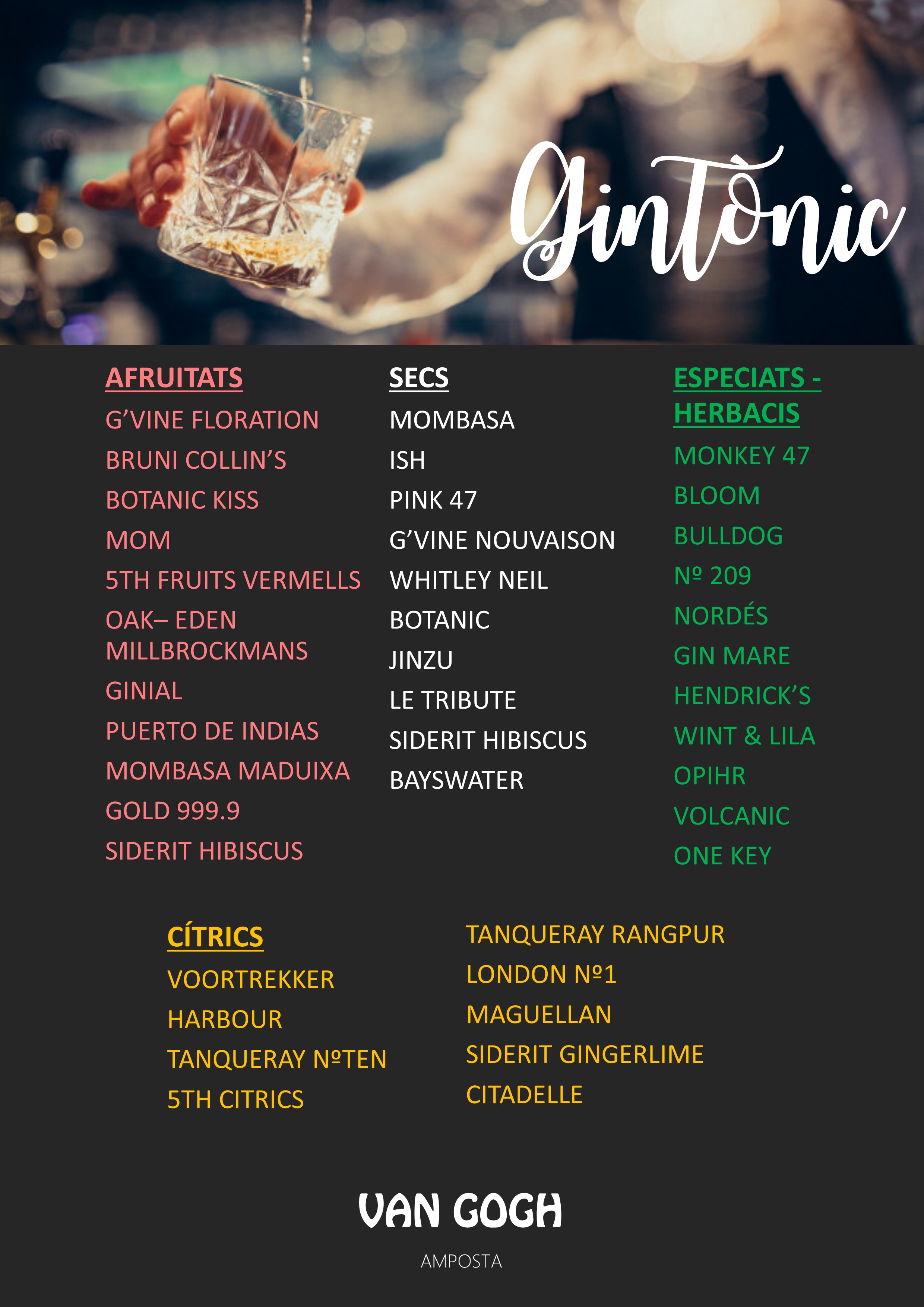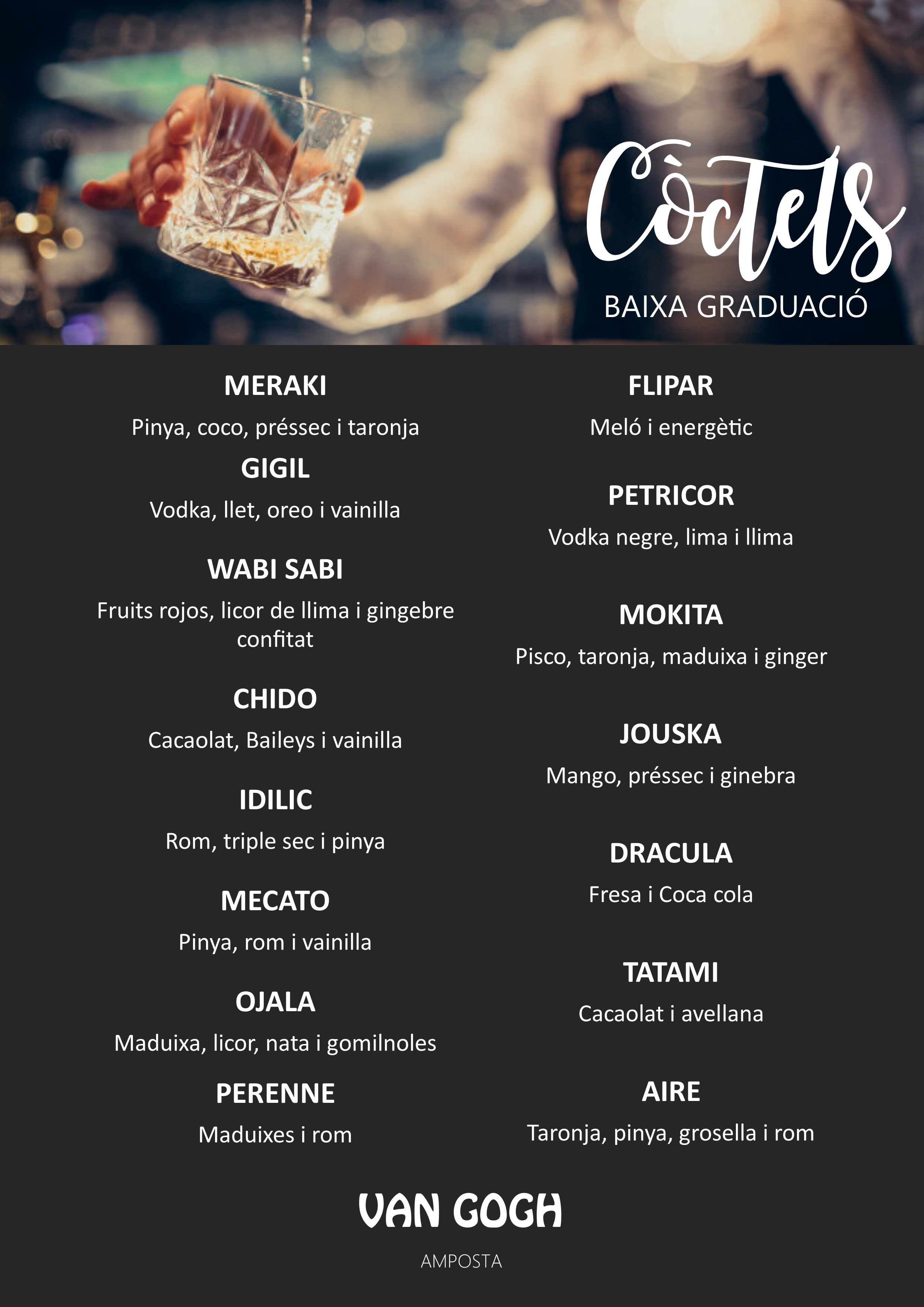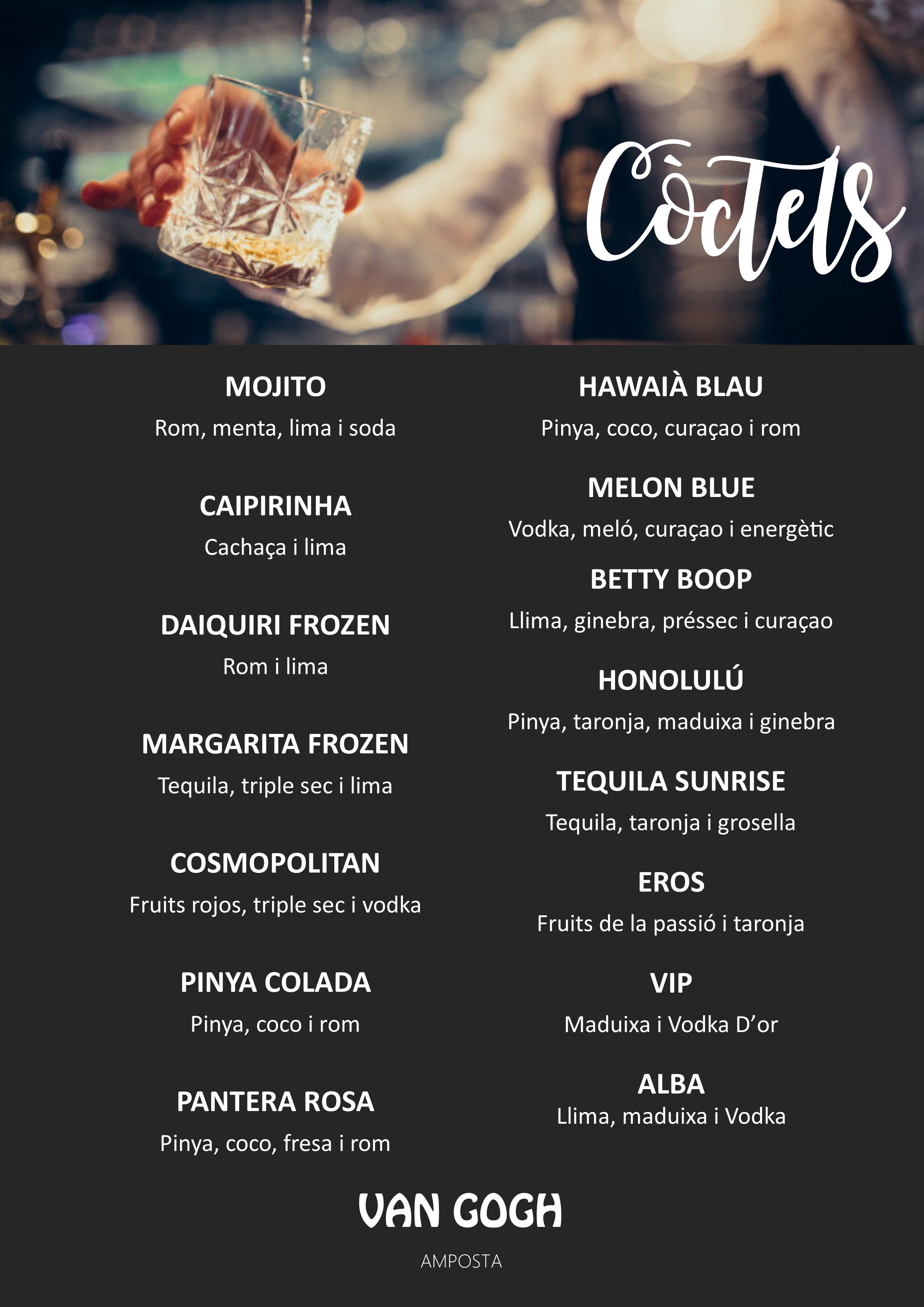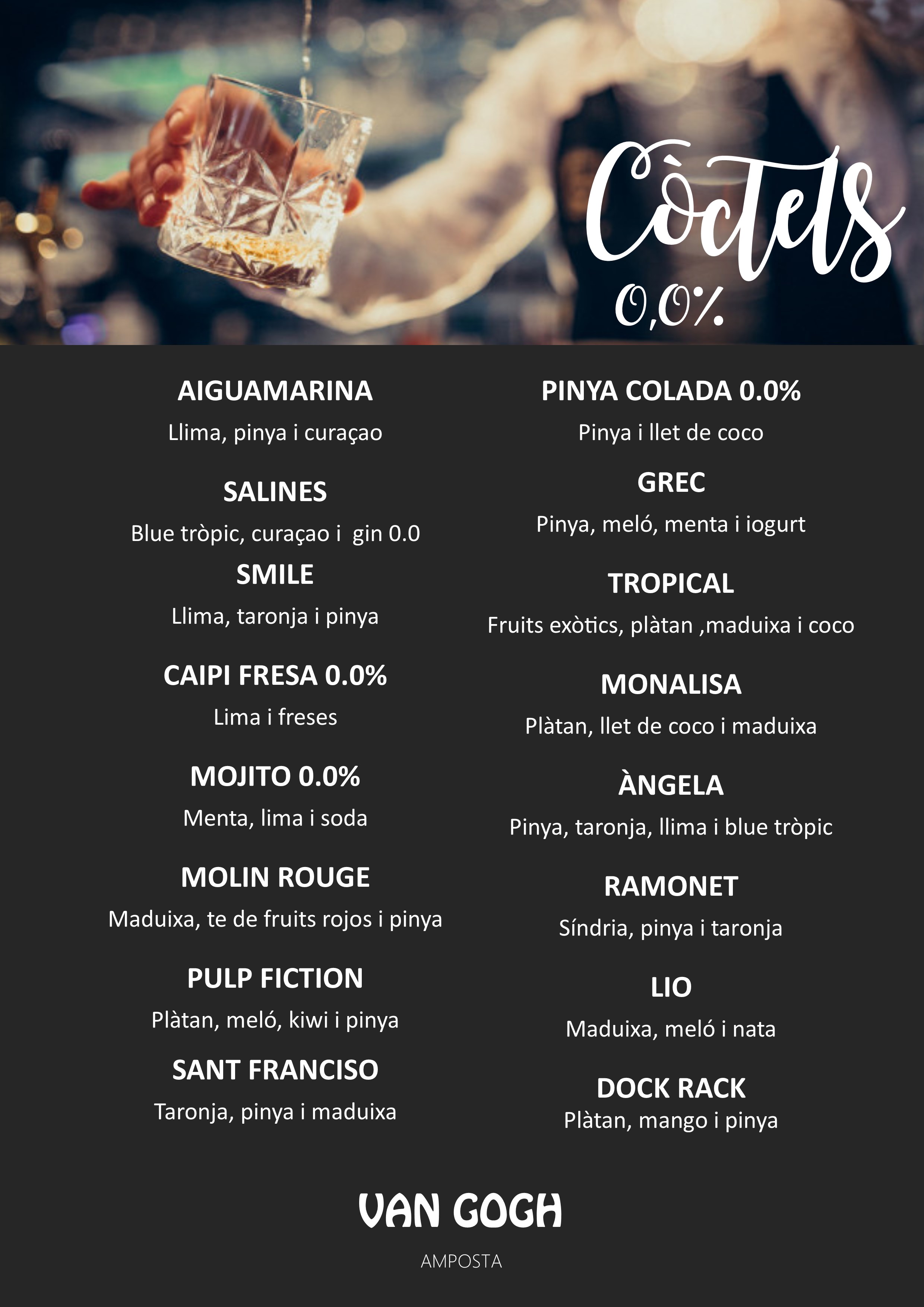 Bé, no cal dir que és un lloc per a beure i gaudir de tota mena de gustos. Aquí podem trobar una ampla gamma de còctels internacionals, gintònics elaborats i whiskies de malta escocesos, però també una extensa carta de begudes refrescants, sucs naturals i cafè aràbiga. En aquesta secció presentem les diferents begudes agrupades per famílies.