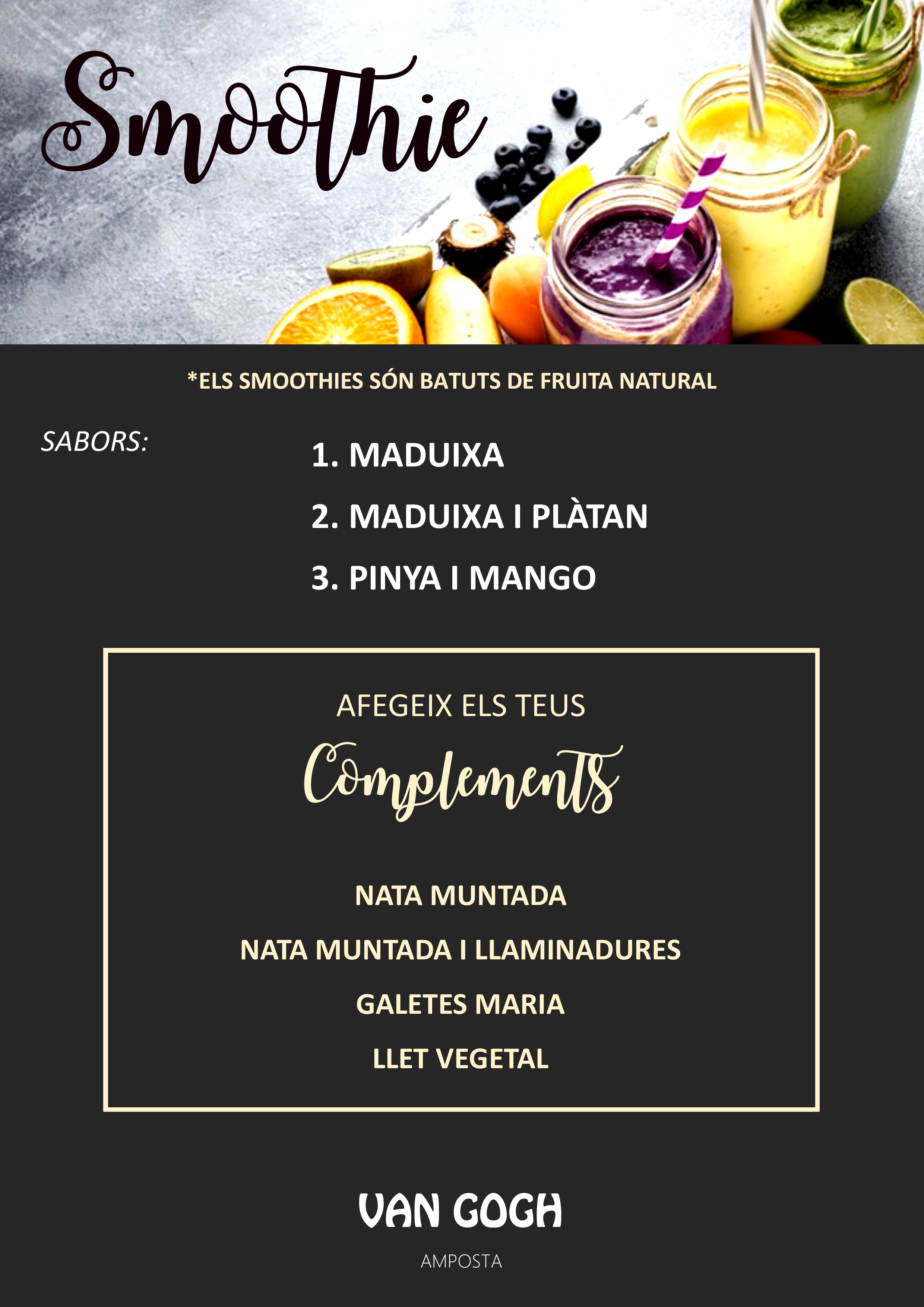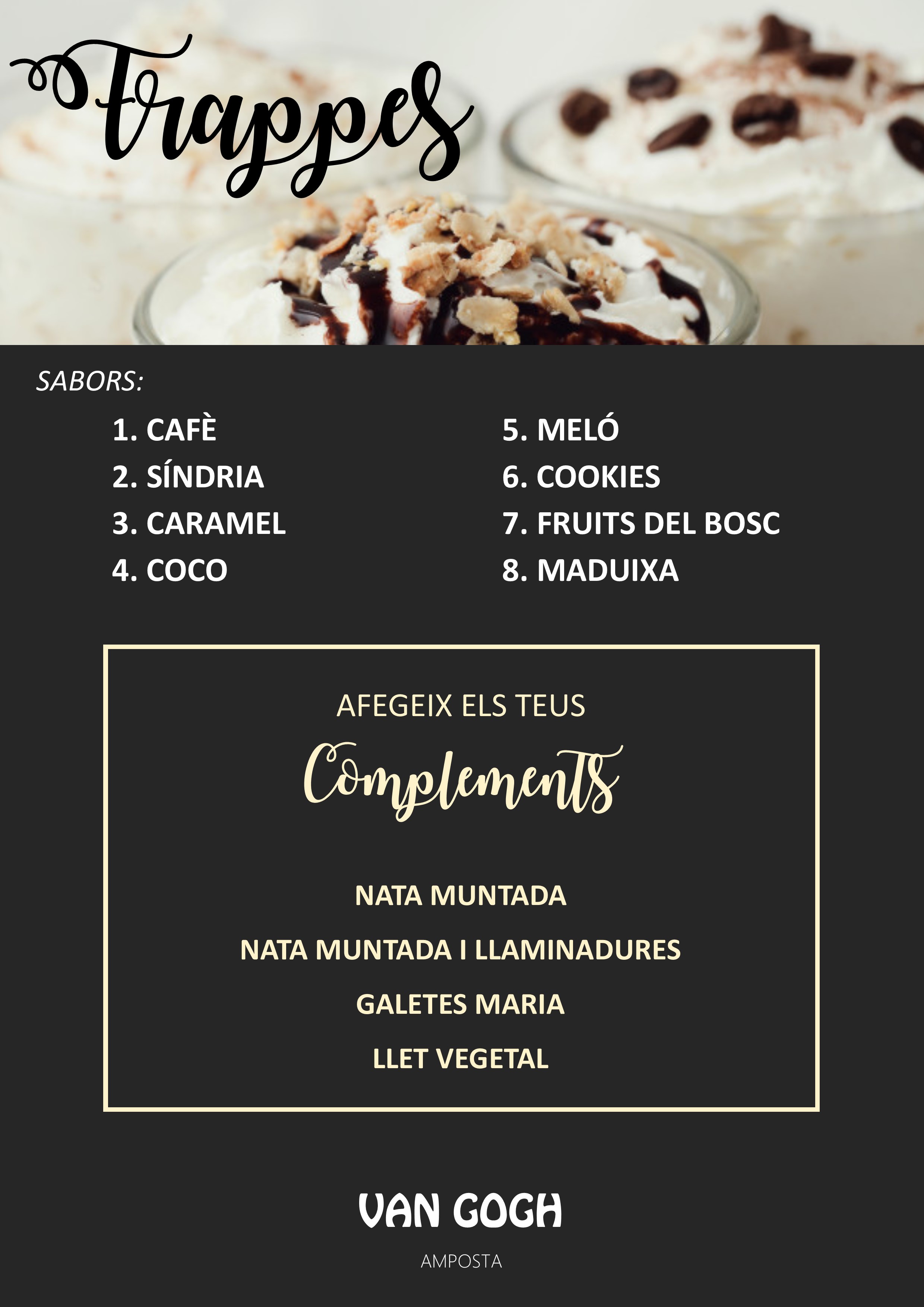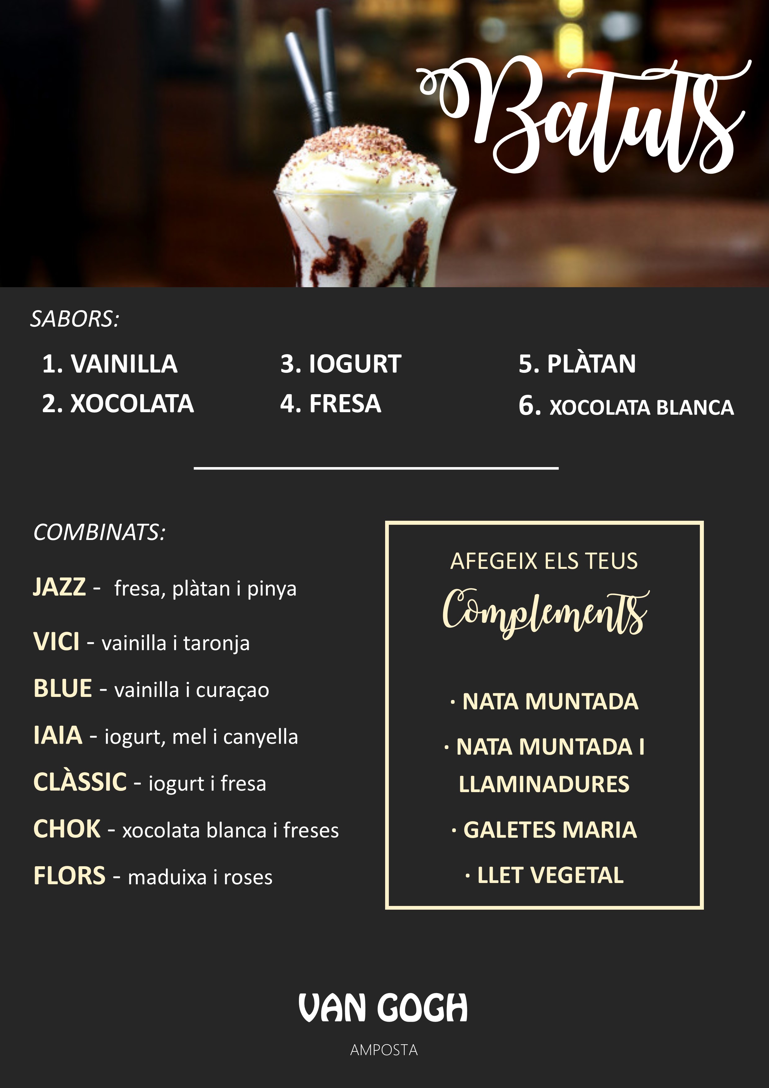 Elaborats de manera artesanal a base de llet i fruites, xocolate o torró, disposem de gelats cremosos i batuts fets amb productes naturals de la màxima qualitat. És un aliment complert que aporta vitamines i nutrients, ideal per a combatre la calor de l'estiu, cosa que requereix d'una acurada planificació. Per als més petits també tenim calipos.